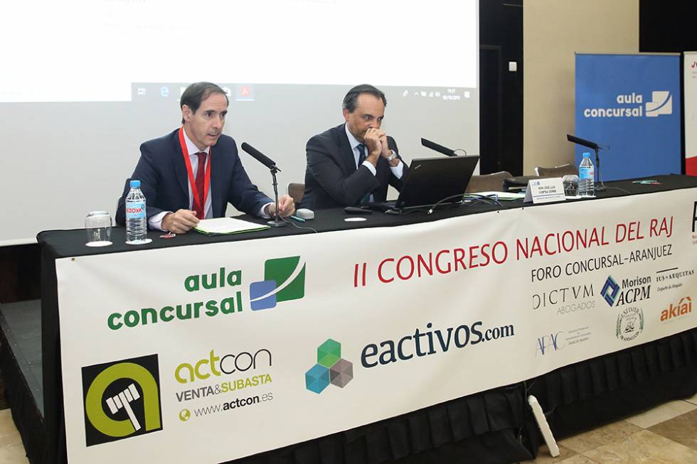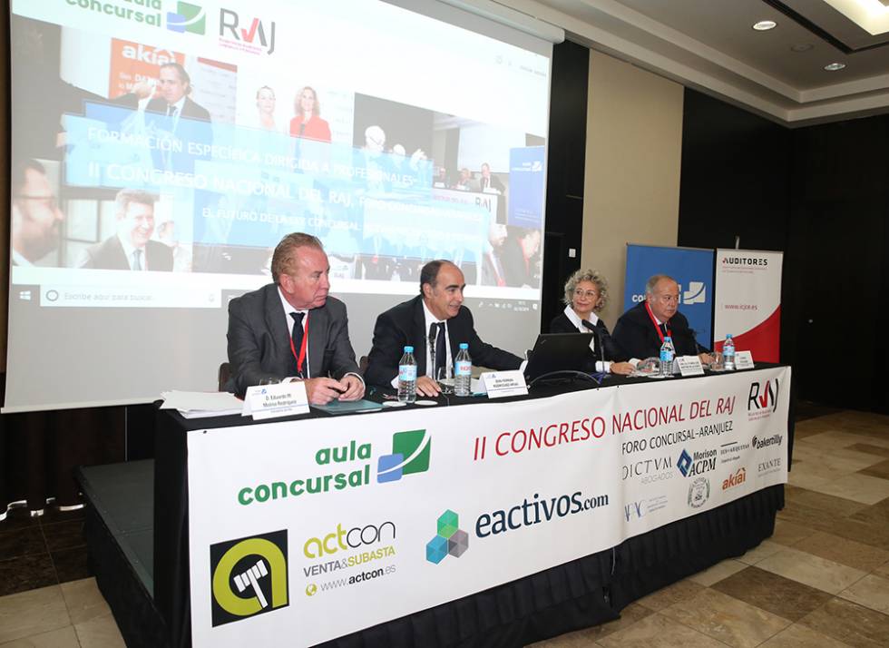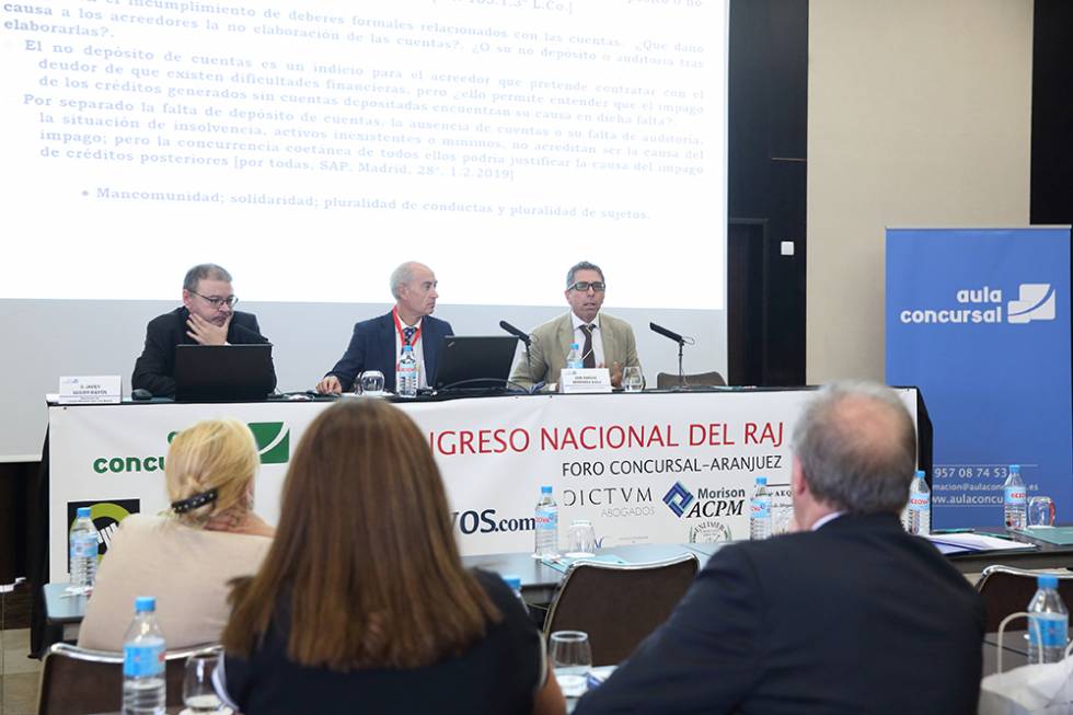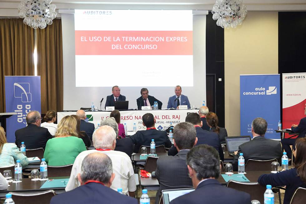 El presidente del RAJ, Eduardo Molina, acompañado del presidente del Instituto de Censores Jurados de Cuentas de España, Ferrán Rodríguez, y del director de Aula Concursal, Rafael Ruiz, presentó los datos obtenidos por este estudio en el II Congreso Nacional del RAJ-Foro Concursal en Aranjuez. Muchos de los encuestados creen que existe un deterioro en la tramitación de los procesos concursales, especialmente en el cumplimiento de plazos, por lo que se alargan más de lo debido.